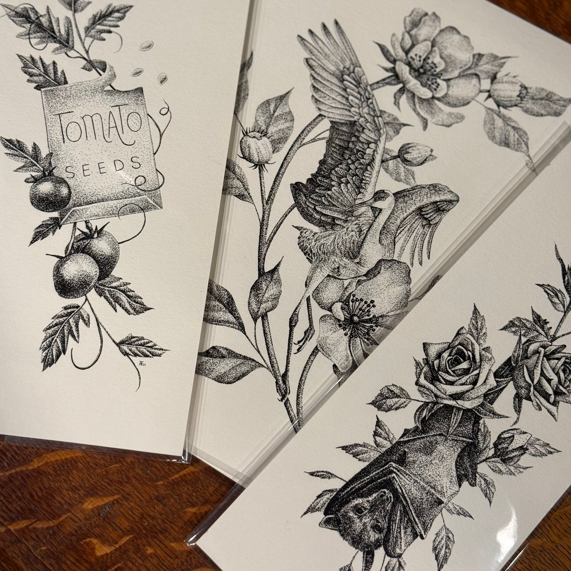 Alyssa co-owns and tattoos at Gilded Sage in Rocky Hill, she is a lifelong artist and enjoys creating in nearly any medium. She began specializing in tiny watercolors about 10 years ago and has painted hundreds of them over the years. Her watercolors are around an inch in size and all prints are reproduced to the original painted size. Alyssa also has a collection of prints representative of her tattooing style, all made with a tattoo machine and dotwork ink cartridge. Her final offering is a collection of dried floral earrings, she dries the florals herself and carefully pairs them in tiny glass earring vials.